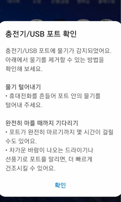 스마트폰 충전포트 물기가 있을 수가 없는데도 물기 감지 메시지가 나타난다면